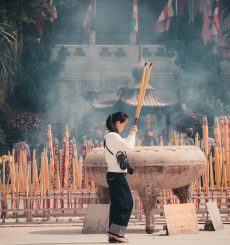 A serene scene of traditional rituals at the temple, where incense offerings fill the air, symbolizing deep devotion and culture.